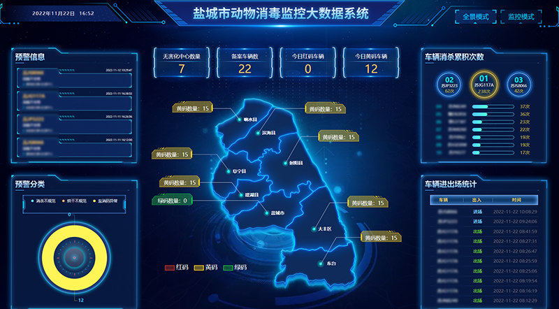 在项目一期的基础上,盐城市农业综合行政执法监督局对现有前端视频图像采集点重新选点布局,包括车辆感知设备、视频监控设备、进出场道闸等,进一步加强平台对车辆洗消的智能监控;通过构建天网系统,在7个无害化处理中心设置监控区域,量化监控指标,设置实时报警功能,实现车辆洗消全过程的智能监控;借助车辆GPS定位器、智能传感器、高温监控摄像头、温度传感器、门禁系统等硬件的配备,结合车辆备案档案管理、消毒监控指挥大屏、盐消码查询管理等软件系统的运用,实现车辆洗消烘的全程可追溯。