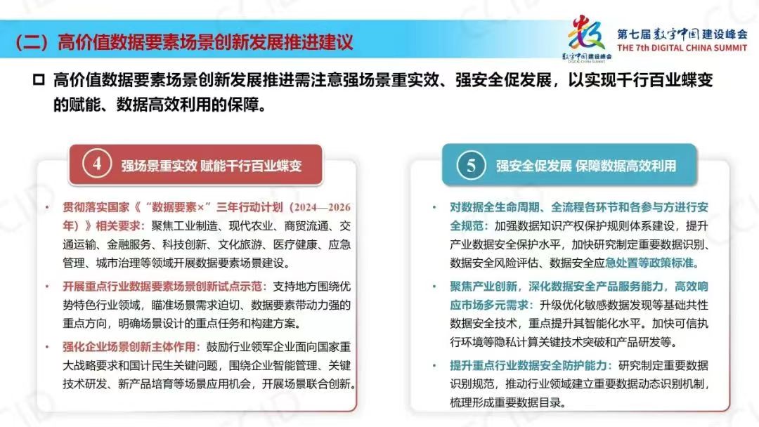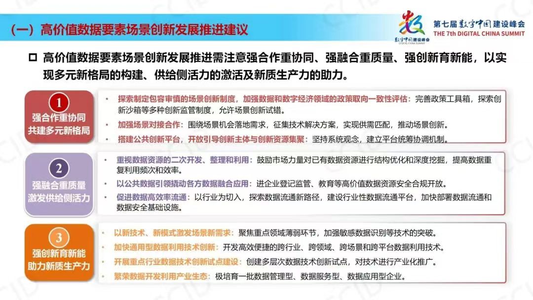 数据作为新型生产要素,是培育和发展新质生产力的关键力量。释放数据要素乘数效应,需要发挥各方积极性,遵循产业发展规律,深度赋能千行百业。《报告》认为高价值要素场景创新发展还需进一步优化市场各主体关系,推动政府、企业、机构、高校多元合作;加强融合应用,重视数据资源结构优化和开发利用效率;着眼全局推进场景建设,打破体制和区域等限制;推动数据要素融入新场景,拓展大数据应用;发展与安全并重,留足产业发展空间,保障数据高效利用。